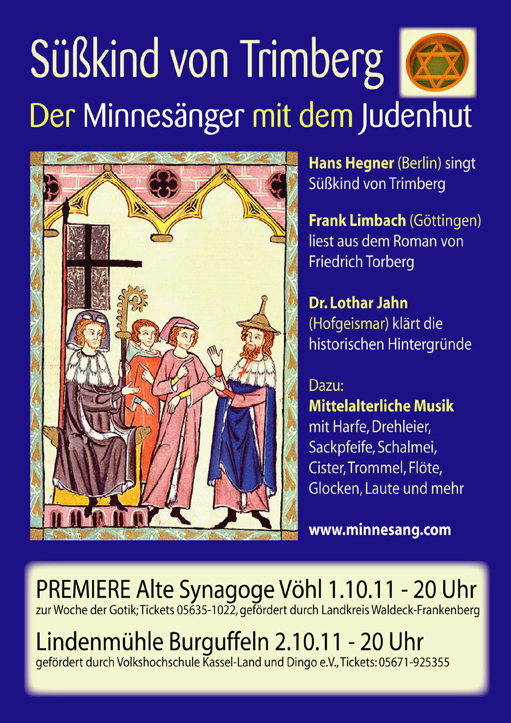 Minnesang.com Dr. Lothar Jahn Guderoder Weg 6 34369 Hofgeismar 05671-925355 E-mail an Minnesang.com HANS HEGNER UND LOTHAR JAHN Duoprogramm SPIELLEUTE bei der Ensemble-Fassung des Süßkind-Programms: Cosima Hoffmann Claudia Heidl Gerda Weinreich Jan-Marcus Lapp (Fotos: Archiv Minnesang.com) (Fotos aus der Alten Synagoge: Dr. Lothar Jahn) Plakat zur Veranstaltung hier. |